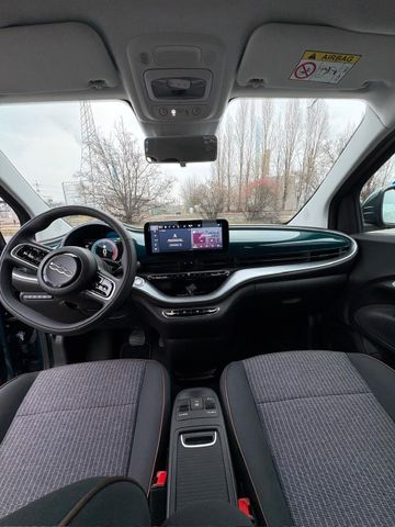 Airbag Fahrer-/Beifahrerseite, Ambiente-Beleuchtung, Antriebs-Schlupfregelung (ASR), Armaturenbrett farbig (Wagenfarbe), Autom. Begleitfunktion der Beleuchtung (Follow me home), Außenspiegel mit Abdeckkappen schwarz, Beifahrerairbag abschaltbar, Einschaltautomatik für Fahrlicht / Lichtsensor, Elektromotor 70 kW (cont. 43 kW), Fahrassistenz-System: Aufmerksamkeits-Assistent, Fahrassistenz-System: Autonomer Notbrems-Assistent (AEB), Fahrassistenz-System: Bremsassistent, Fahrassistenz-System: Spurhalteassistent, Fahrassistenz-System: Verkehrszeichenerkennung, Fahrmodusschalter, Halterung Smartphone, Heckleuchten LED, Heckscheibe heizbar, HV-Batterie 23,8 kWh (Lithium-Ionen), Infotainment-System: UConnect 5 mit Navigationssystem, DAB+ und Bluetooth-Freisprecheinrichtung (Touchscreen 10,25"), Infotainment-System: UConnect mit DAB+ Radioempfang (Touchscreen 10,25"), Instrumentenanzeige Farbdisplay, 7 Zoll, Karosserie: 3-türig, Klimaautomatik, Kopf-Airbag-System vorn, Kopfstützen hinten, Lenkrad (Soft Touch) mit Multifunktion, Lenksäule (Lenkrad) höhenverstellbar, LM-Felgen, Memoryfunktion für Sitz vorn links, Mobile Online Dienste UConnect Live, Nebelschlussleuchte, Notrufsystem (eCall), One Pedal Drive (elektronisches Gaspedal), Parkbremse elektrisch, Radioempfang digital (DAB+), Scheinwerfer H4, Schnellladefunktion 50 kW (DC), Seitenairbag vorn, Seitenschutzleisten schwarz glänzend, Sitzbezug / Polsterung: Stoff, Sitzverstellung vorn rechts (4-fach), Smartphone Schnittstelle (Apple CarPlay & Android Auto), Sonnenblenden mit Spiegel (beleuchtet), Steckdose (12V-Anschluß) vorn, Tagfahrlicht LED, USB-Schnittstelle, Wärmeschutzverglasung